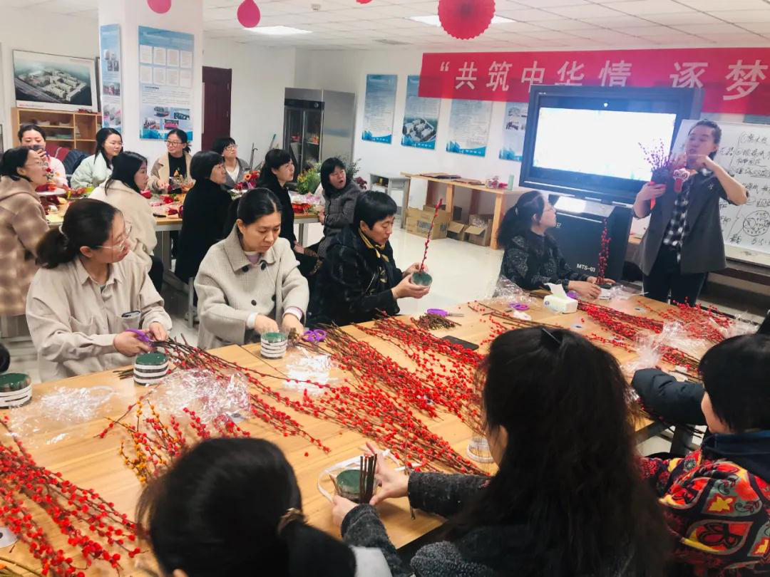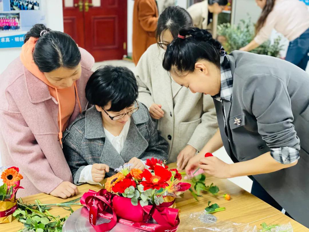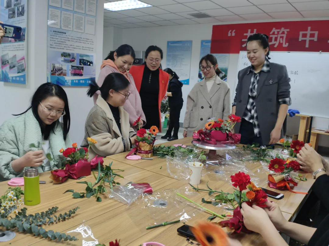 老师们兴高采烈地拿起剪刀、修剪花枝、设计花型,制作花器。空气中氤氲着花香的甜蜜,老师们的脸上洋溢着快乐的笑容,学校领导的到来给大家带来了节日的祝福与问候,如融融春日,温暖人心。