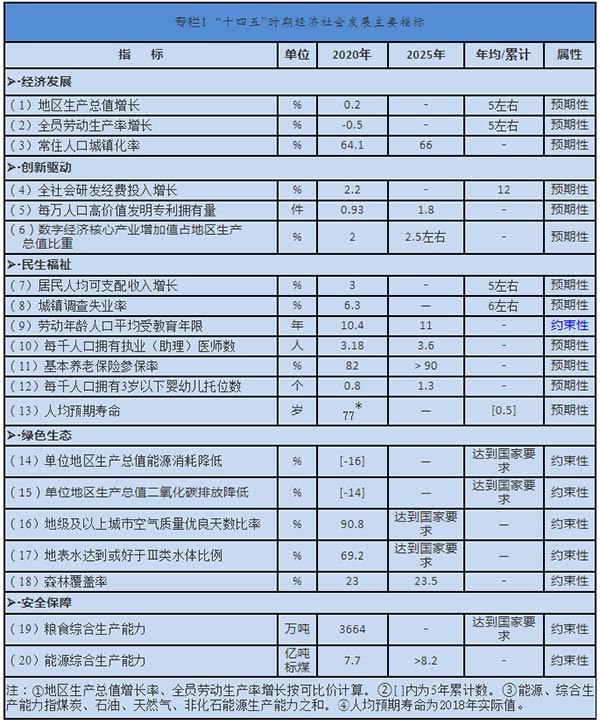 此外,“十四五”时期经济社会发展主要目标,设置经济发展、创新驱动、民生福祉、绿色生态、安全保障五大类20项,