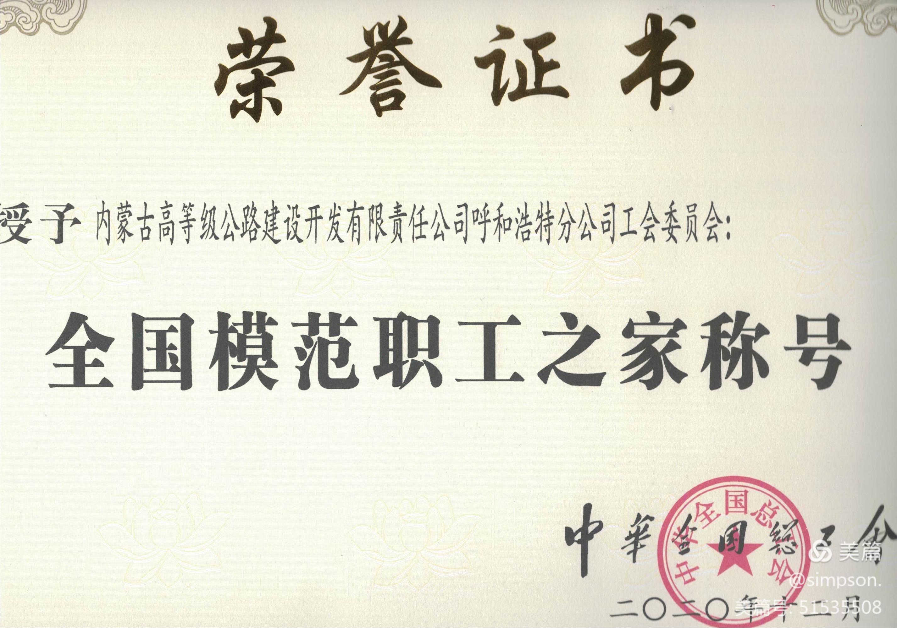 近日,内蒙古高路公司呼和浩特分公司工会委员会经各级工会的层层推荐,被中华全国总工会授予了全国模范职工之家荣誉称号,这是继2015年的全国交通运输系统先进集体及2020年的全国职工职业道德建设先进单位之后的又一国家级荣誉。