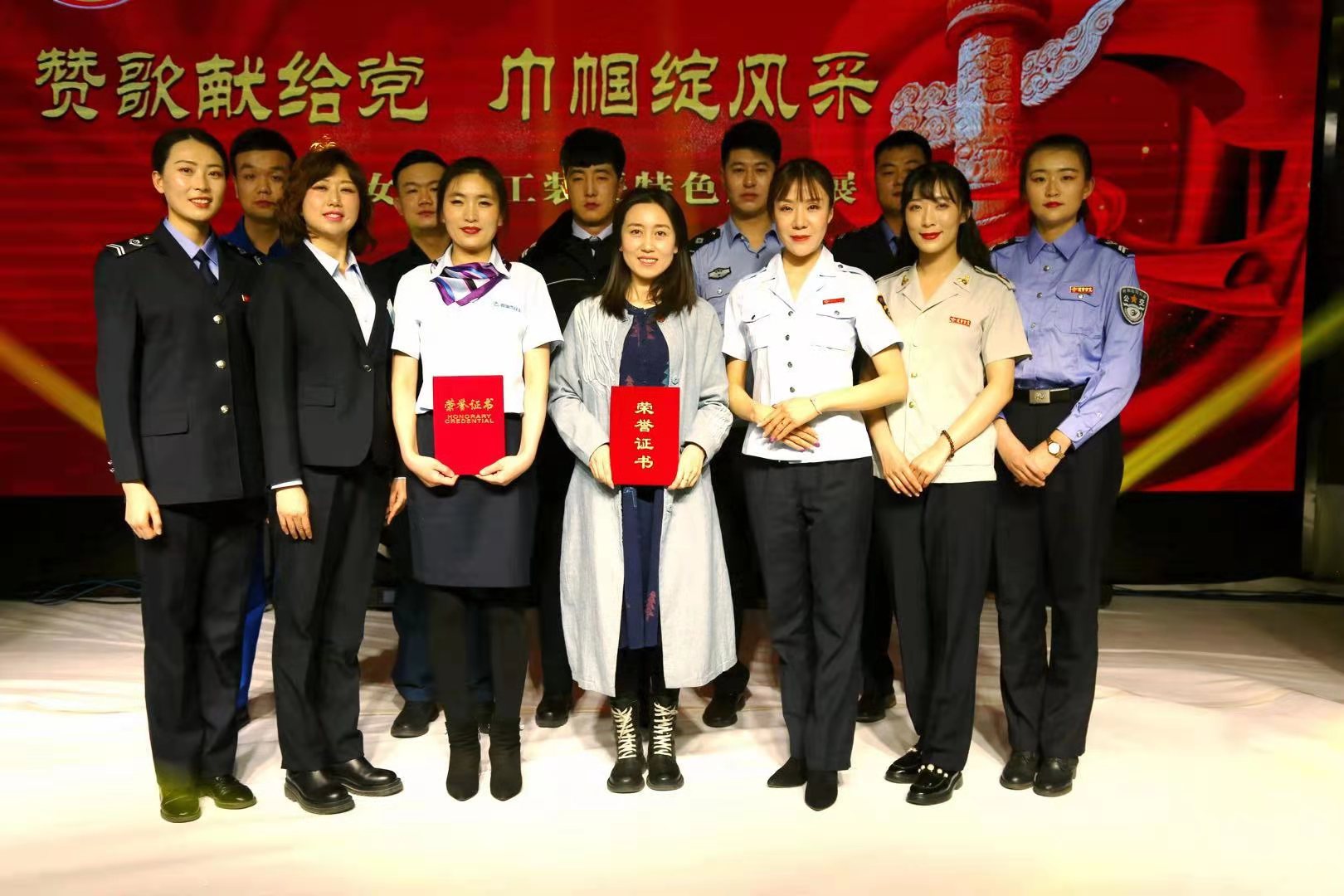 来自全区建筑交通机冶系统13个代表队以良好的精神风貌展示了各行各业的职业风采。在绚丽的舞台上工装及特色服饰展示,彰显了职业女性和中华服饰文化的魅力。