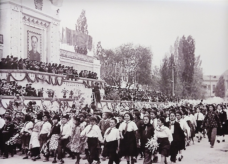 1955年10月,新疆维吾尔自治区成立。成立大会上,少年先锋队游行队伍欢快地走过主席台;