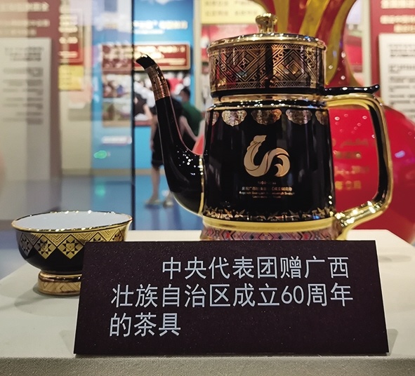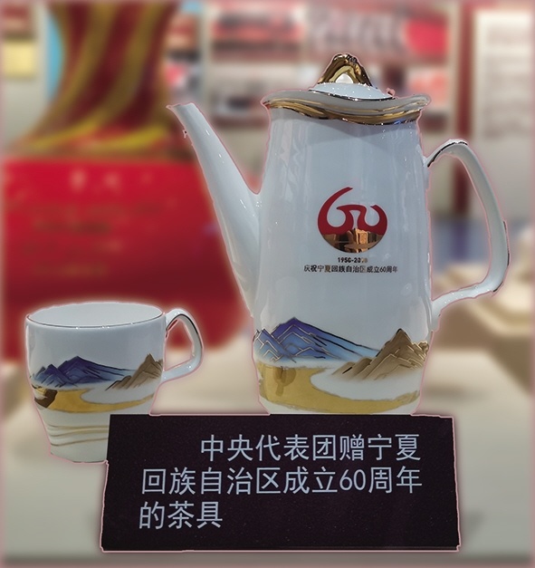 展览里,陈列着各自治区大庆时中央代表团赠送的礼品:新疆维吾尔自治区成立60周年时,中央代表团赠送的石榴花瓶;宁夏回族自治区成立60周年时,中央代表团赠送的茶具……一件件珍贵的礼物,躺在展柜里,讲述着民族区域自治制度的光辉成就,昭示着民族区域自治制度的光明未来。