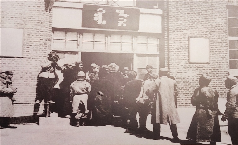 这是一幅黑白照片。画面中,一场会议即将开始,代表们正排队步入会场。旁边,一位摄影师举着照相机,对准有序排队的人群按下快门。年代有些久远,画面有些模糊,已看不清人物面部的细节,但仍能感受到庄严的氛围。