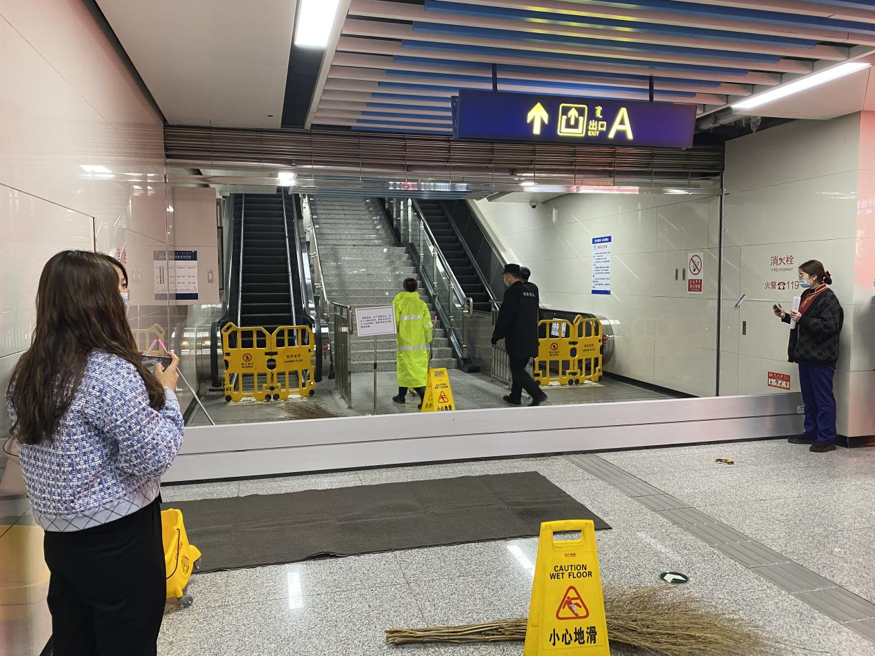 呼和浩特东站A口为敞开式出入口,是1号线前期防汛排查结果的重点部位,此次演练模拟了出入口雨势增大发生倒灌,工作人员发现险情后立即通知相关人员,在接到警情后,迅速赶到现场进行抢险作业,并妥善处理。演练从接警、人员物资到位、应急抢险作业、现场善后处理等环节严格卡控,抢险过程总用时18分11秒,达到了预期演练效果。