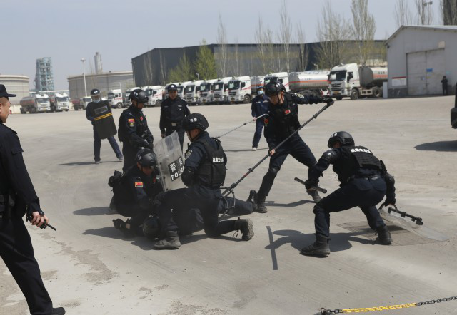 按照防范应急处置预案,3名手持凶器的“歹徒”闯入,泼洒汽油,实施破坏袭击,企业巡防安保人员发现异常迅速报警,并集合企业应急处置小分队与“歹徒”进行周旋,压缩“歹徒”活动空间,将“歹徒”逼离重点区域,拉响疏散避险警报。特警支队处突警力携装备赶到现场,与安保人员密切配合,利用盾、棍、钢叉配合将“歹徒”制伏。