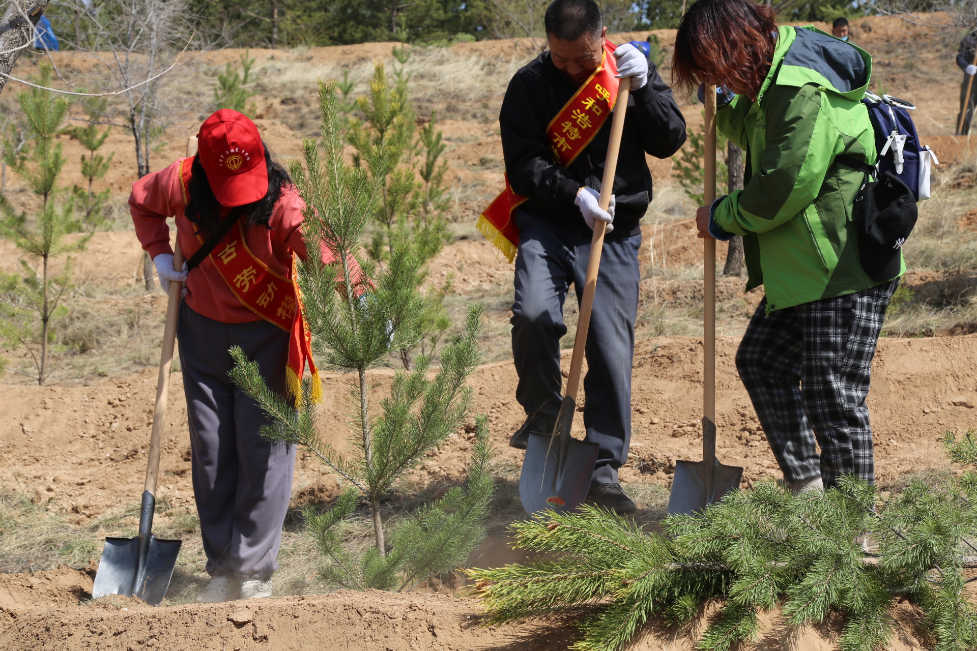 和林格尔县人大常委会副主任、总工会主席蒲喜万带领单位全体干部职工并组织20多名县内青壮年劳模参与了义务植树活动。