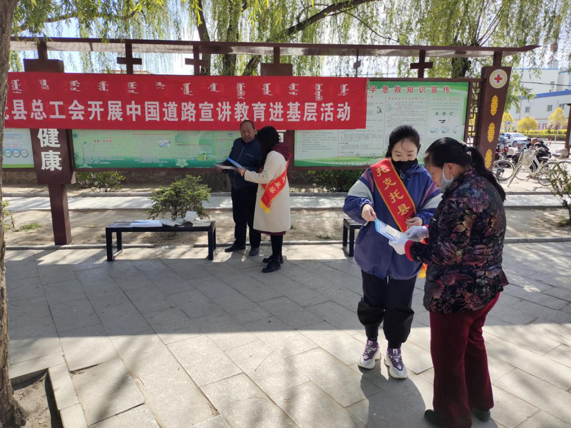 4月27日下午,县总工会全体职工开展中国道路教育专题学习。利用载体营造氛围。充分利用清明、五一等重要时间节点,依托县总工会“智慧工会平台”、微信公众号以及室外宣传电子屏,开展中国道路宣传,营造浓厚的氛围。