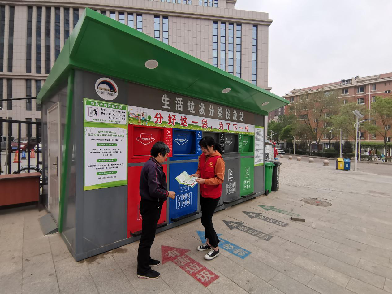 5月14日上午,赛罕区总工会、阿拉坦社区在金河湾小区分类投放点组织开展垃圾分类志愿服务活动。