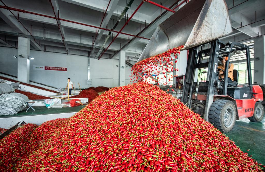 工人在遵义市新蒲新区一家辣椒加工企业内转运辣椒(2020年8月13日摄)。新华社记者陶亮摄