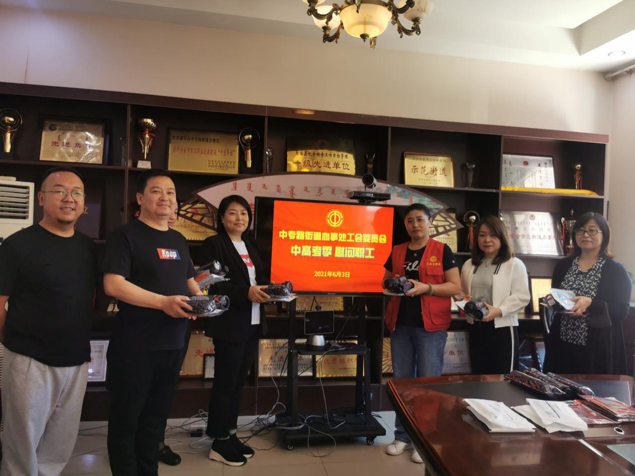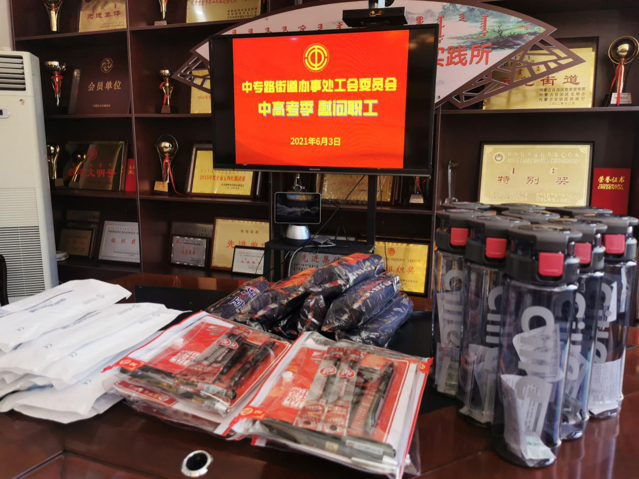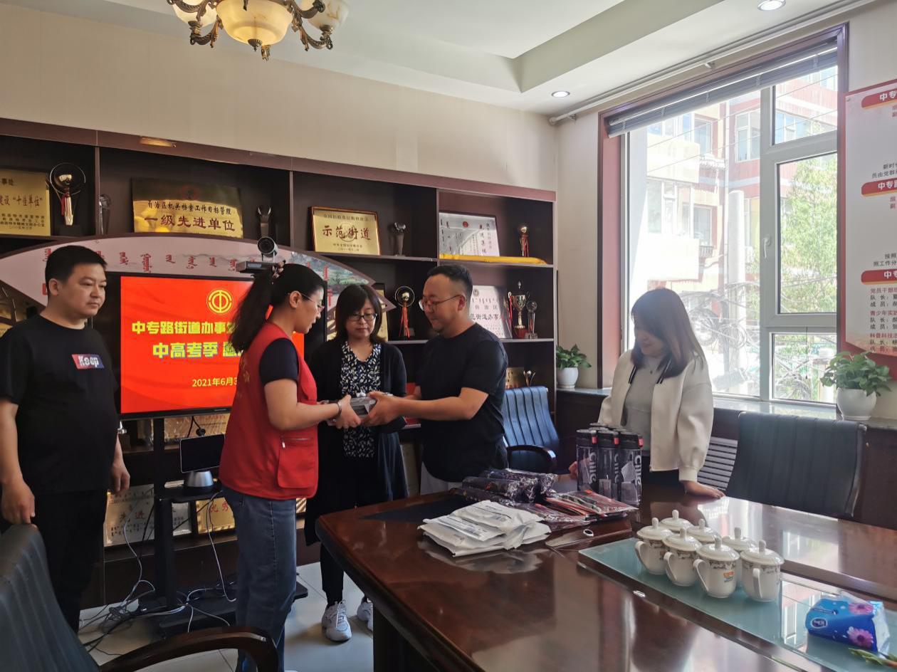 6月3日,中考、高考临前,赛罕区中专路街道工会委员会,为家有中高考孩子的街道干部职工赠送文具、遮阳伞、水杯和一次性口罩,为即将奔赴考场的孩子们加油助威,祝他们金榜题名,前程似锦。