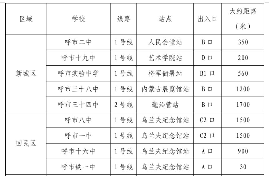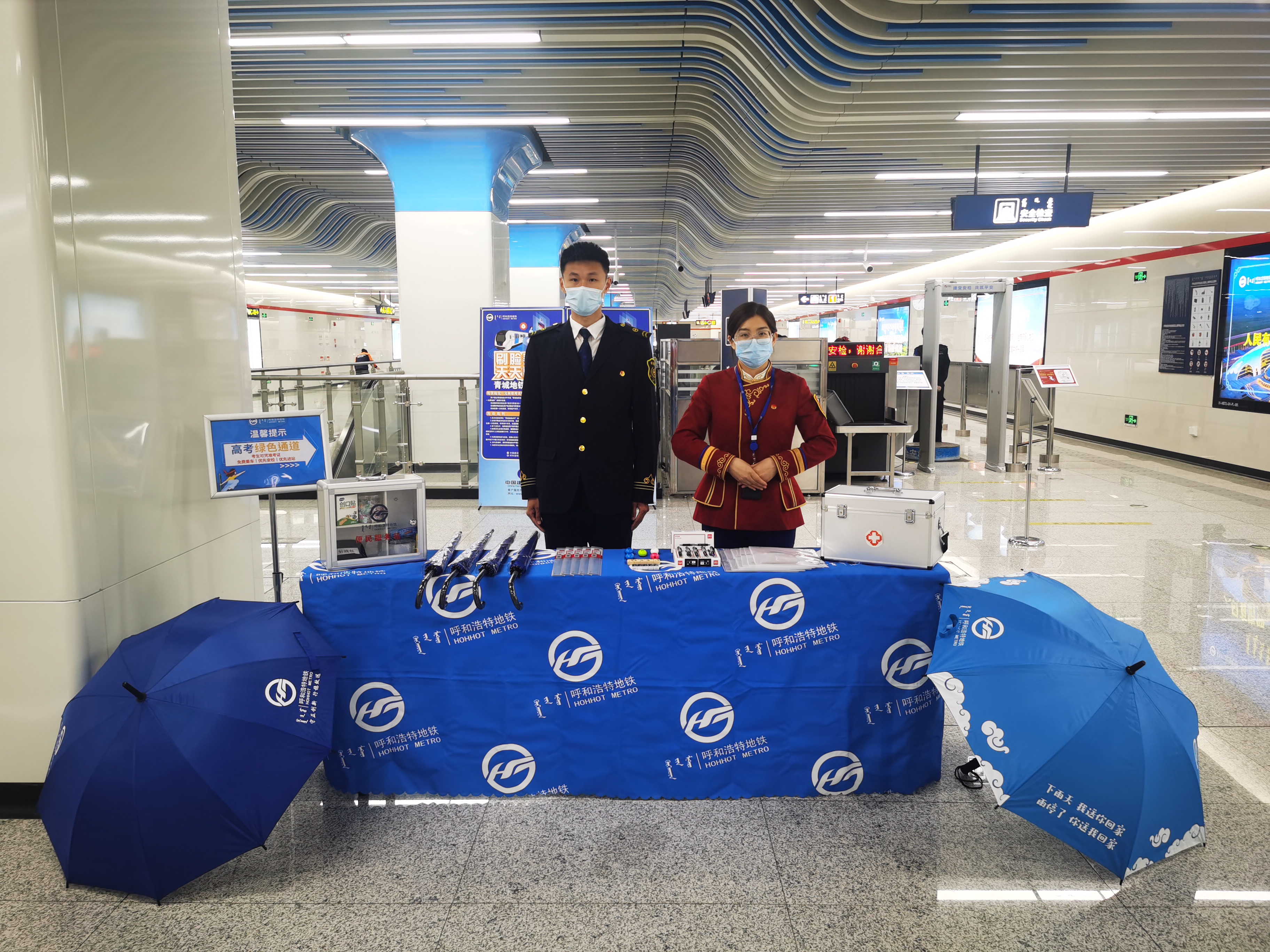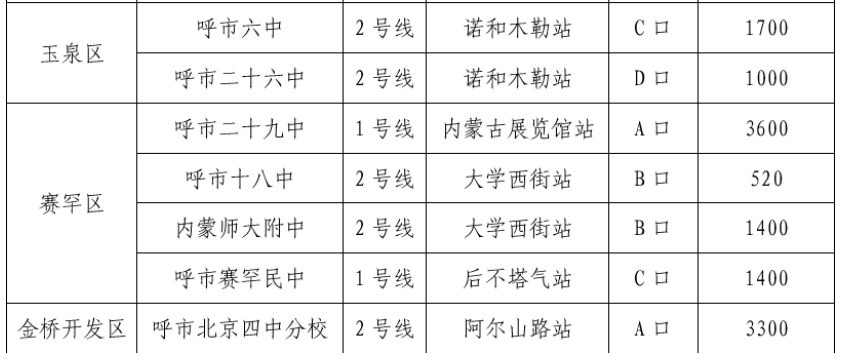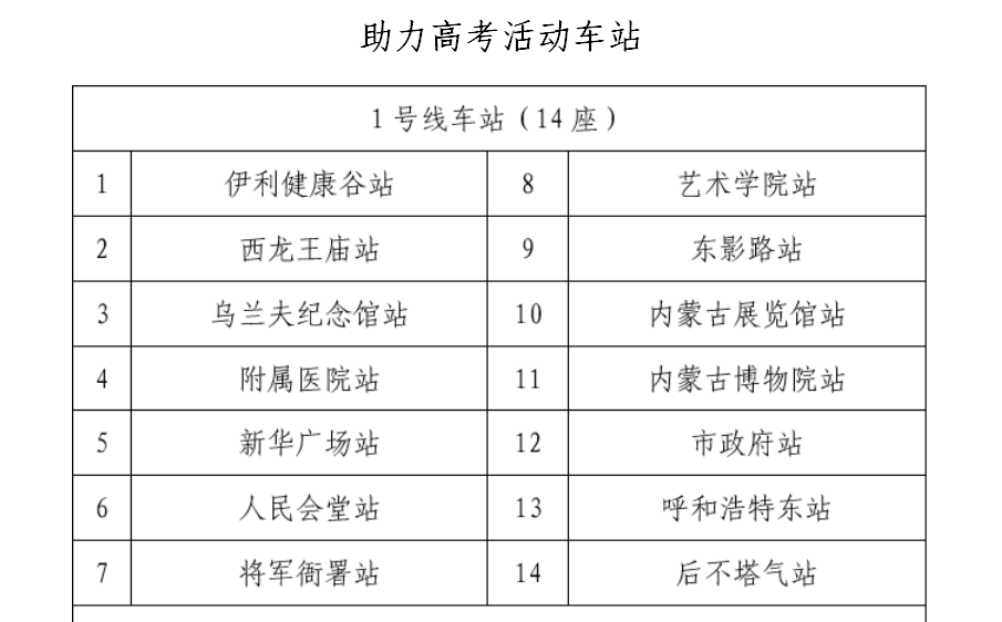 呼和浩特地铁沿线考点及主要住宅区域的28座车站均设有“爱心助考点”,为考生免费提供文件袋、黑色中性笔、直尺、橡皮、卷笔刀以及口罩、爱心雨伞、应急雨具、便民服务箱等物品。