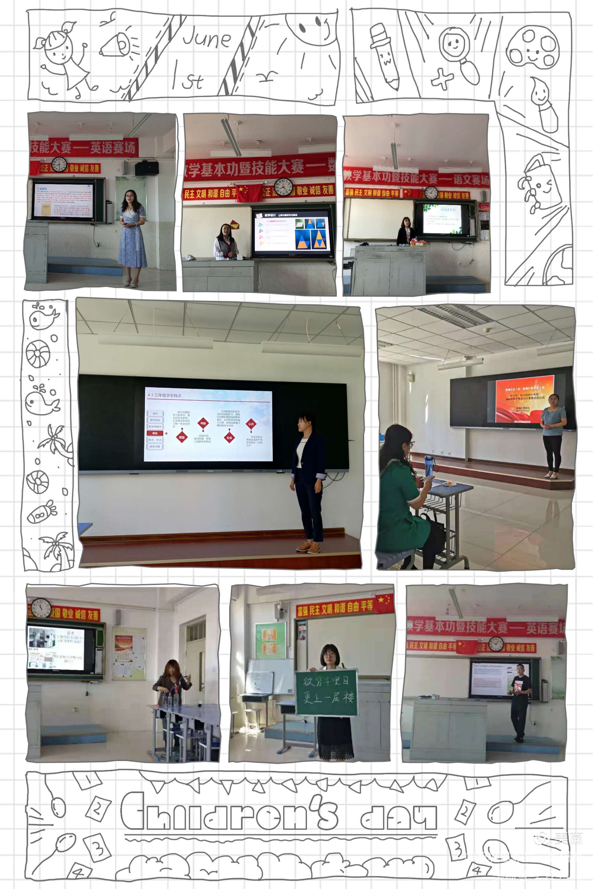 本课比赛,中小学基本功展示活动由说课、教学设计、粉笔字三部分组成。幼儿园青年教学基本功展示活动由比说课、主题画、讲故事、歌表演四部分组成。