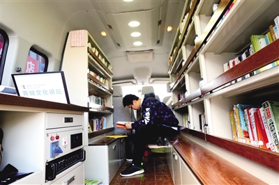 呼和浩特市图书馆鸿雁悦读流动服务车开进呼和浩特职业技术学院开展流动服务送书。