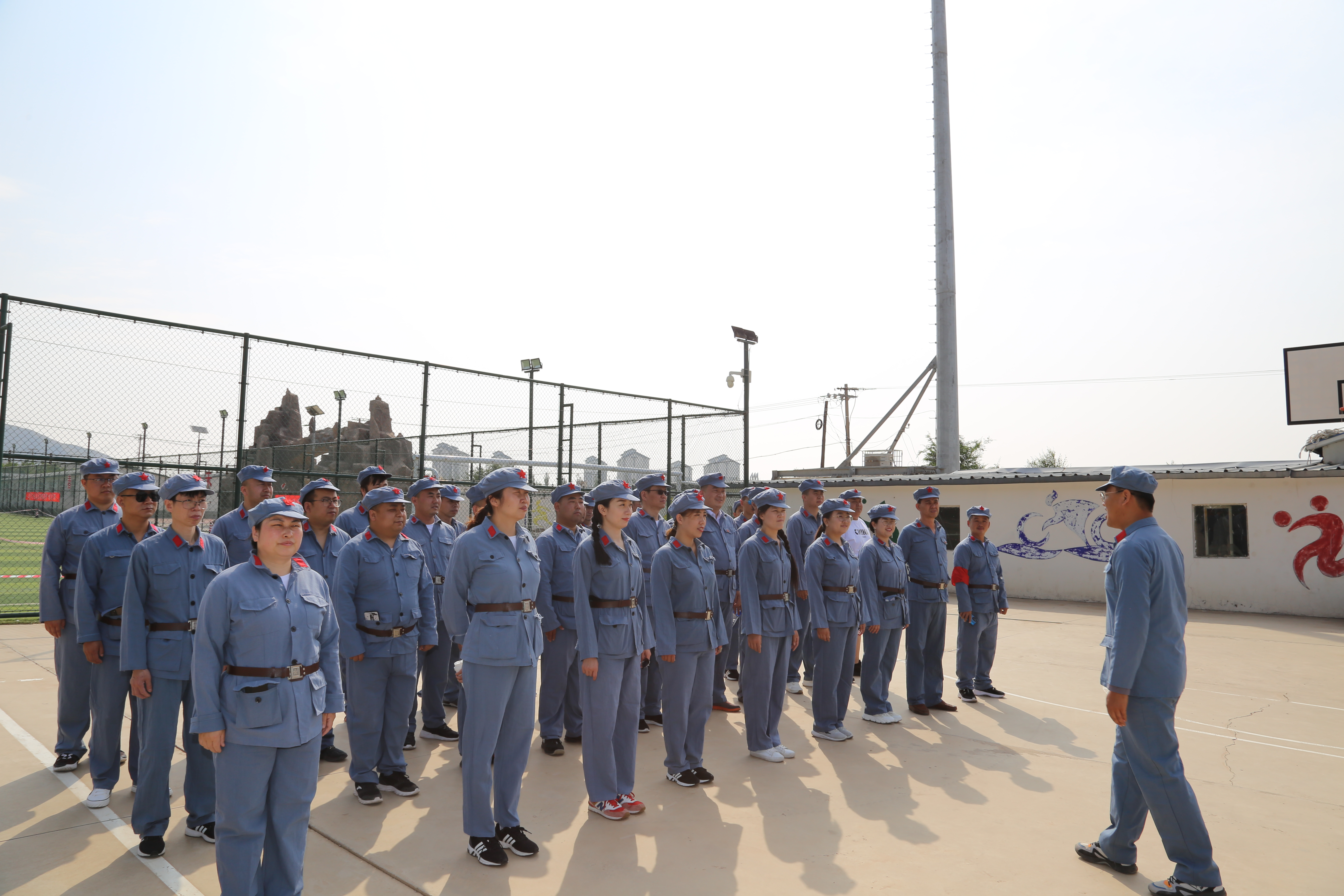 12日上午,大家抵达戎培鸿图湾教育基地。在培训基地教官的指挥下,统一着装红军衣,练习军姿队列。大家一共分为红一连、红二连、红三连、红四连四个连队。