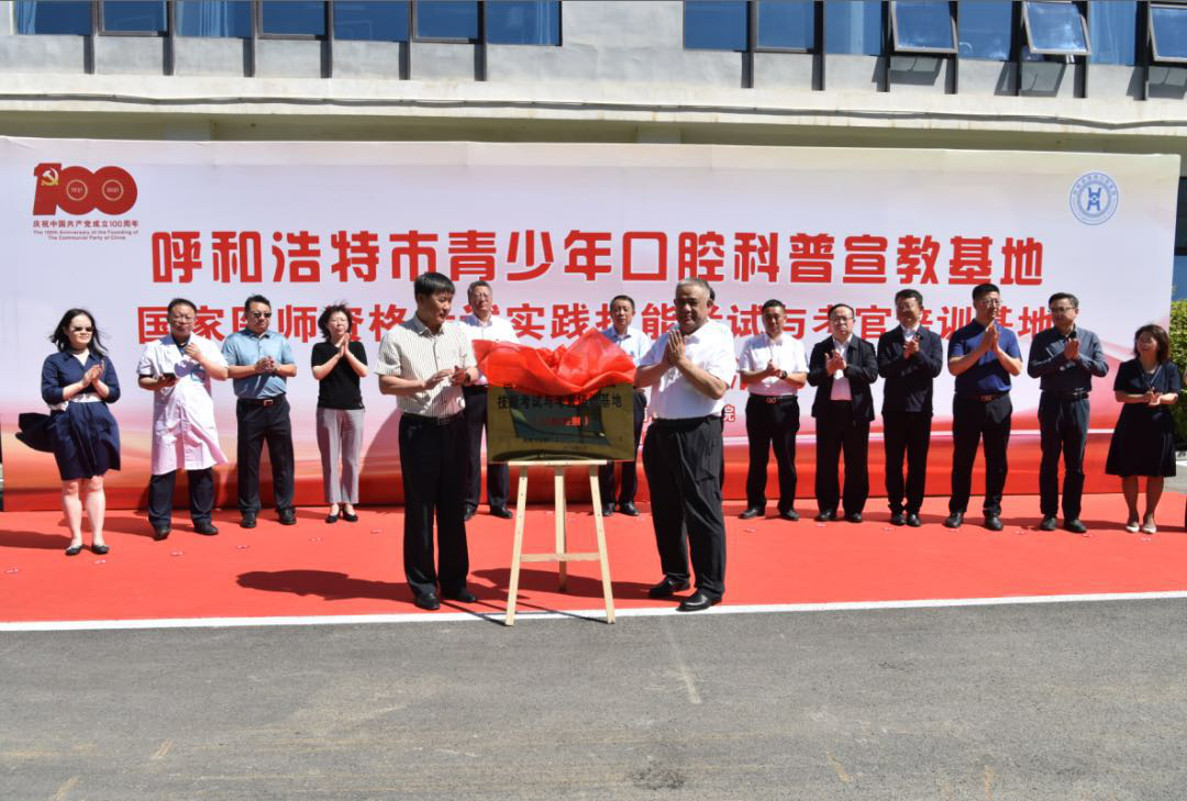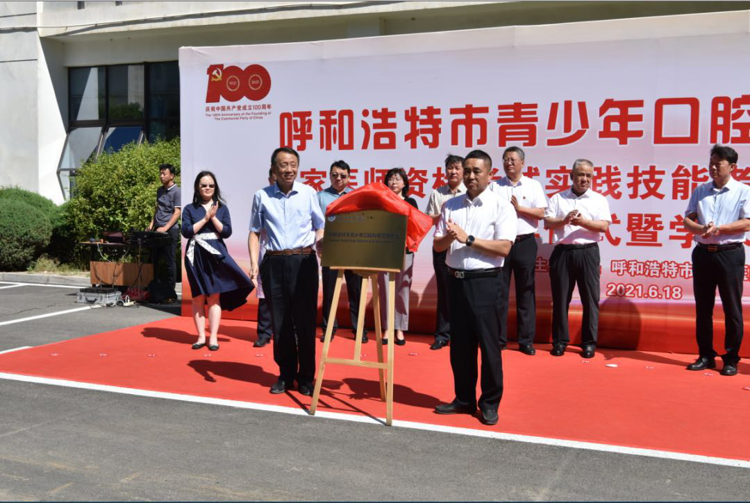 内蒙古自治区卫生考务中心主任、医师资格考试领导小组办公室常务副主任乔文华,市卫生健康委党组书记云文清,共同为“国家医师资格考试实践技能考试与考官培训基地(口腔类别)”揭牌。