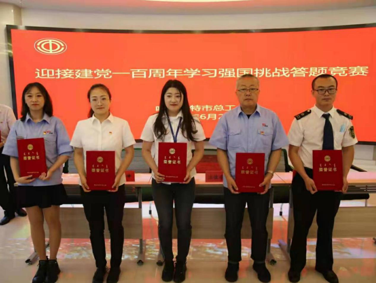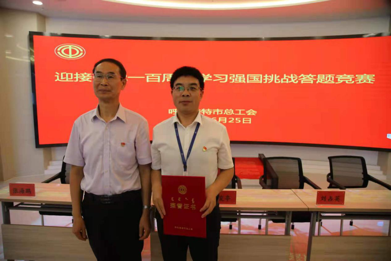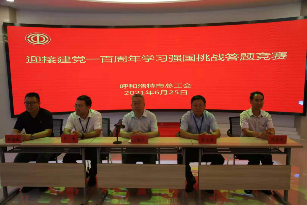 为庆祝中国共产党成立一百周年,深入学习贯彻习近平新时代中国特色社会主义思想,充分利用学习强国平台助推党史学习教育走深走实,激发广大职工学习热情。 6月25日,呼和浩特市总工会在市交通投资建设集团有限公司地铁控制中心内的党群服务中心,成功举办“迎接建党一百周年,学习强国挑战答题竞赛”活动。呼和浩特市总工会党组书记、副主席汪俊亭,呼和浩特市三产服务业工会主席田喜武,市交通投资建设集团有限公司党委书记、董事长刘占英,市交通投资建设集团有限公司党委副书记、总经理李峰参加比赛活动。