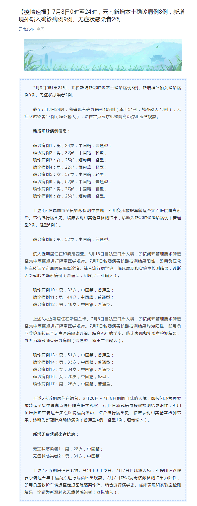 截至7月8日24时,云南省现有确诊病例109例(本土31例,境外输入78例),无症状感染者17例(境外输入),均在定点医疗机构隔离治疗和医学观察。