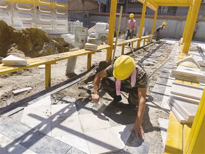 昨日上午,记者走进房产楼小区看到,道路干净整洁,没有私搭乱建现象,小区正在建设的小公园里,新建的景观长廊已经建设完成,工人正在铺装长廊地面。
