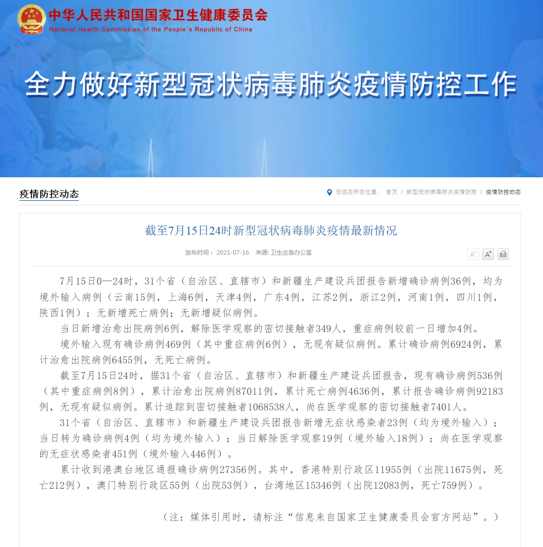 截至7月15日24时,据31个省(自治区、直辖市)和新疆生产建设兵团报告,现有确诊病例536例(其中重症病例8例),累计治愈出院病例87011例,累计死亡病例4636例,累计报告确诊病例92183例,无现有疑似病例。累计追踪到密切接触者1068538人,尚在医学观察的密切接触者7401人。