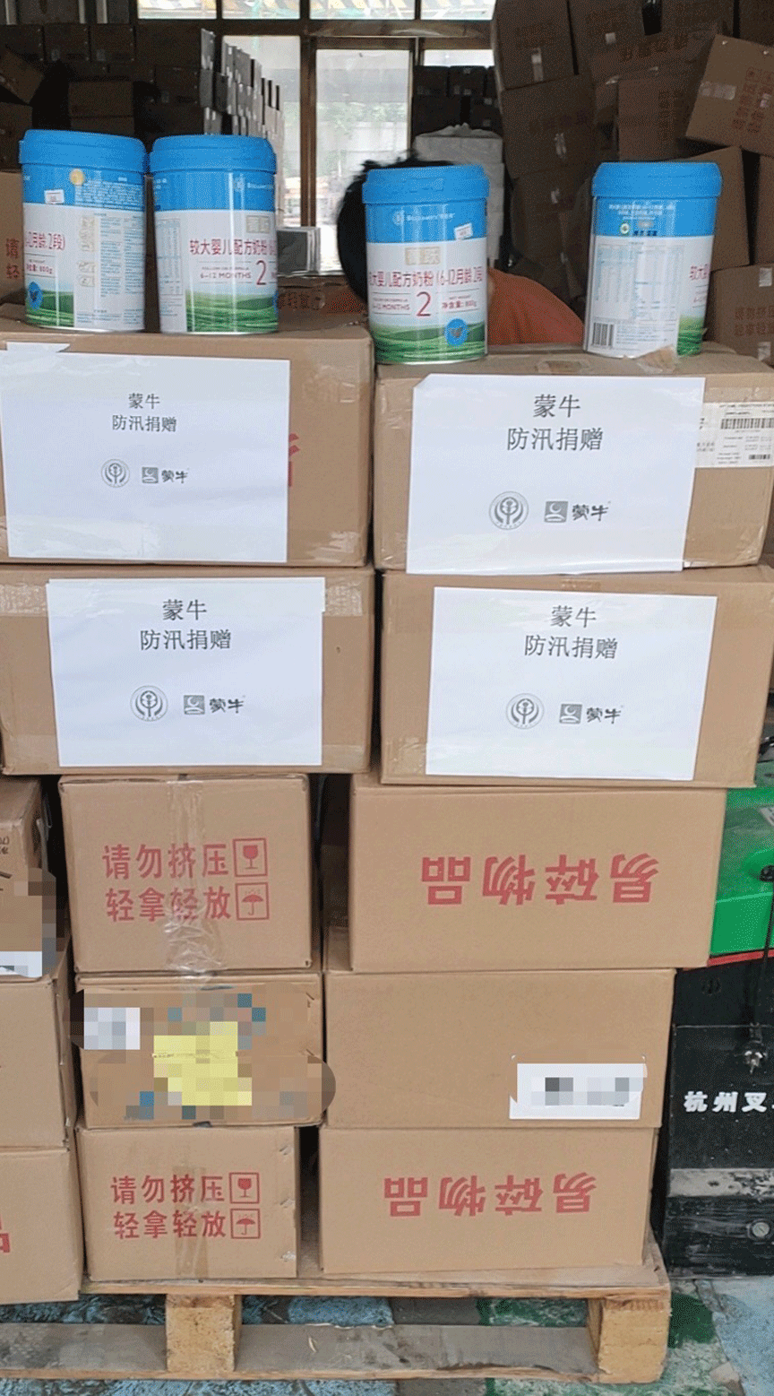 由于郑州市儿童福利院受到严重洪涝灾害影响,孩子们迅速被转移到郑州市委党校,在急需大量牛奶、面包等食物的情况下,蒙牛集团河南区域迅速调集常低温产品瑞哺恩、贝拉米、妙可蓝多等送达一线,为郑州市福利院600名受灾孩子提供牛奶、婴儿奶粉、儿童奶酪,给孩子们送上营养保障。