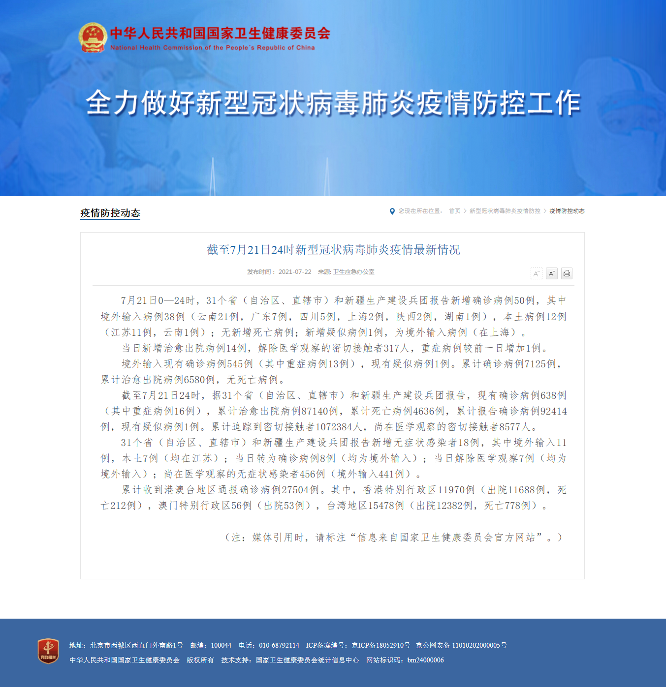 中工网讯 据国家卫健委官网消息,7月21日0—24时,31个省(自治区、直辖市)和新疆生产建设兵团报告新增确诊病例50例,其中境外输入病例38例(云南21例,广东7例,四川5例,上海2例,陕西2例,湖南1例),本土病例12例(江苏11例,云南1例);无新增死亡病例;新增疑似病例1例,为境外输入病例(在上海)。