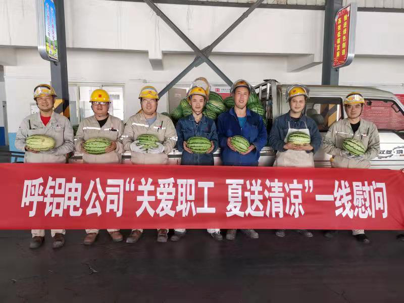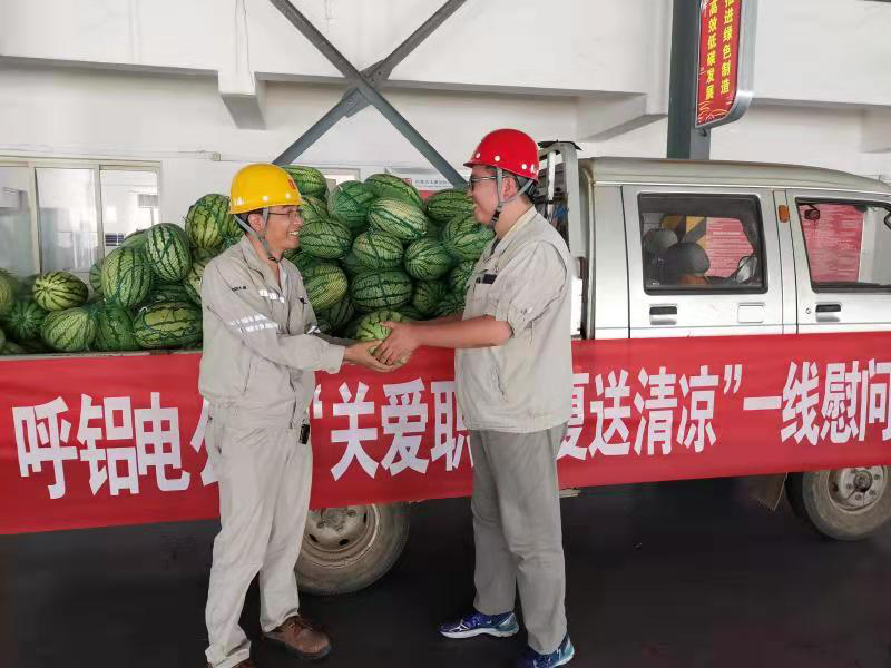 呼铝电公司后勤人员为一线职工精心熬制并送上“解暑秘方”——清热解毒、止渴消暑的“必备饮品”绿豆汤。同时还从实用性、大众喜好程度选择多款清凉解暑、适宜夏日饮用的饮品,发放给公司职工们。此外,呼铝电公司还购买西瓜送到职工手中,瓜香弥漫厂房,让这个夏天不再炎热,职工们吃着西瓜,笑在脸上,甜在心里。