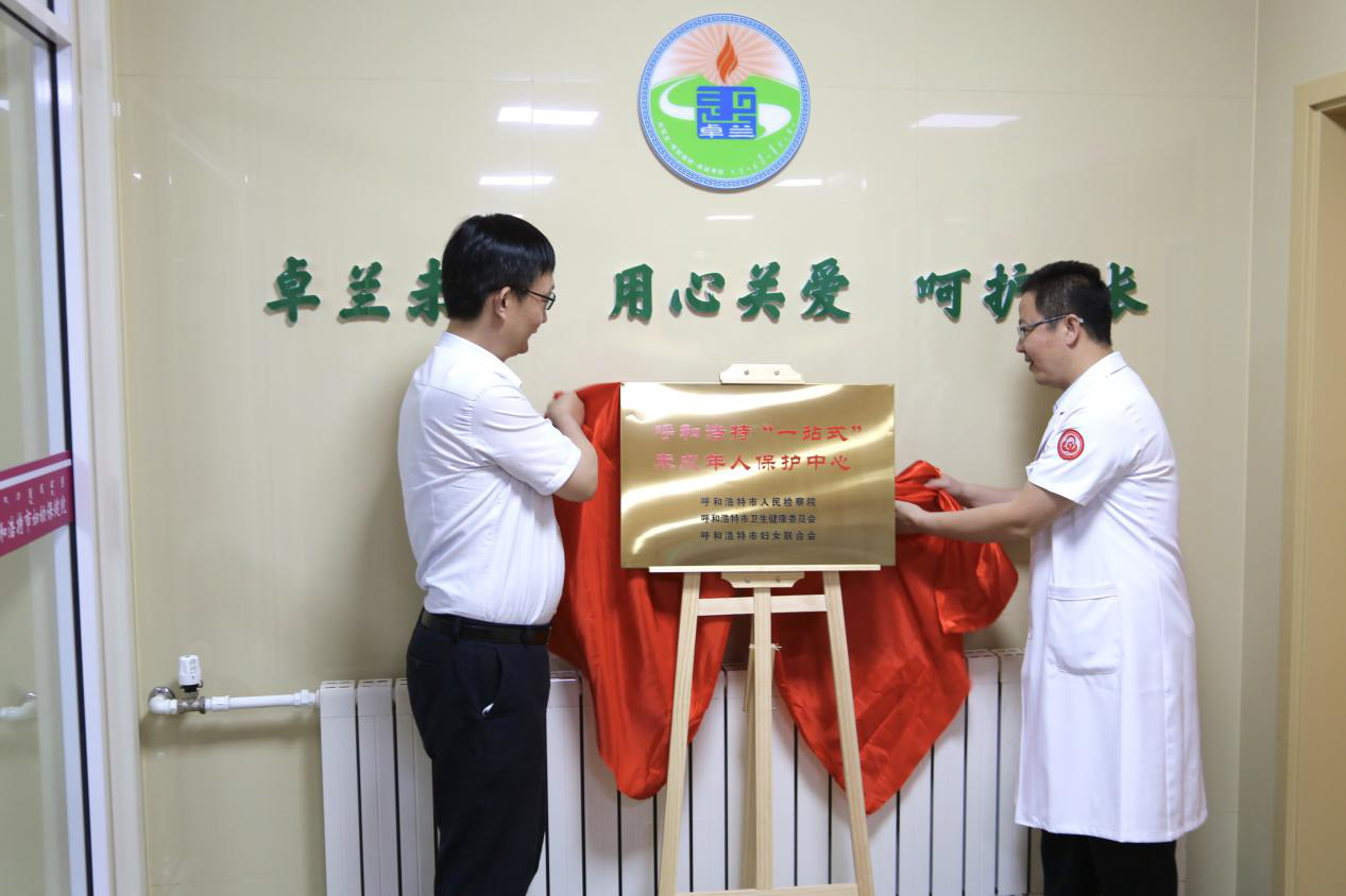 最高人民检察院未成年人检察厅副厅长李峰与呼和浩特市妇幼保健院院长张虎晓共同为呼和浩特市“一站式”未成年人保护中心揭牌,标志着该场所正式投入使用。