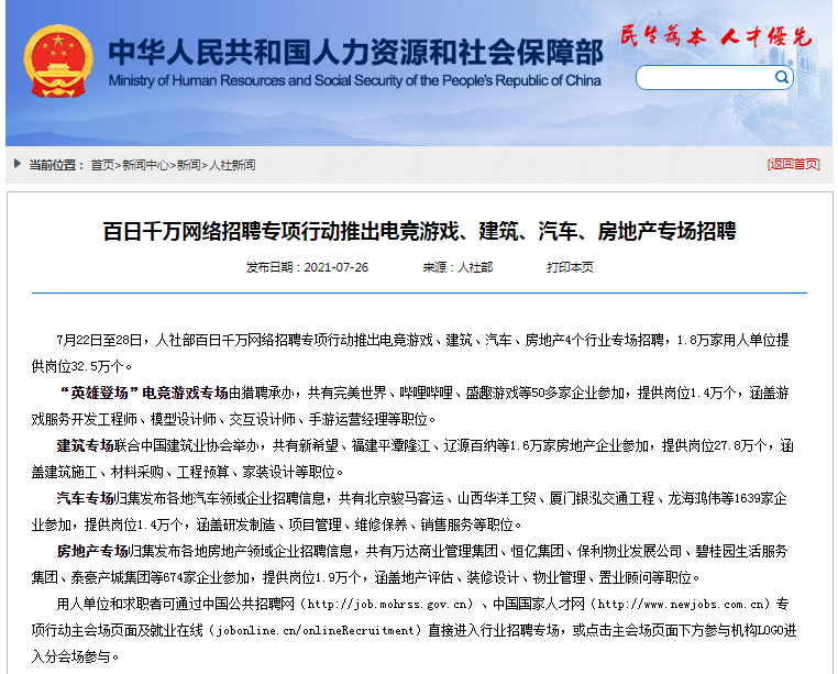 中工网讯 据人社部官网消息,7月22日至28日,人社部百日千万网络招聘专项行动推出电竞游戏、建筑、汽车、房地产4个行业专场招聘,1.8万家用人单位提供岗位32.5万个。
