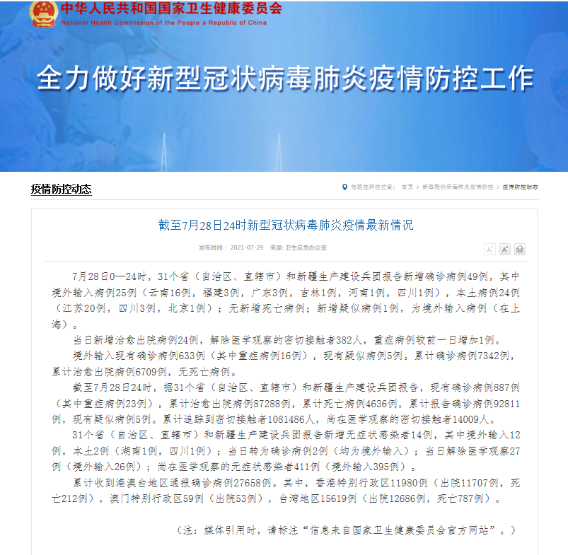 据国家卫生健康委员会官方网站消息,7月28日0—24时,31个省(自治区、直辖市)和新疆生产建设兵团报告新增确诊病例49例,其中境外输入病例25例(云南16例,福建3例,广东3例,吉林1例,河南1例,四川1例),本土病例24例(江苏20例,四川3例,北京1例) ;无新增死亡病例;新增疑似病例1例,为境外输入病例(在上海)。