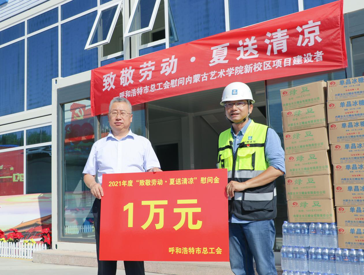 7月30日,呼和浩特市总工会党组书记、副主席汪俊亭一行四人赴内蒙古艺术学院新校区项目,对在高温季节坚持工作的一线员工进行慰问。