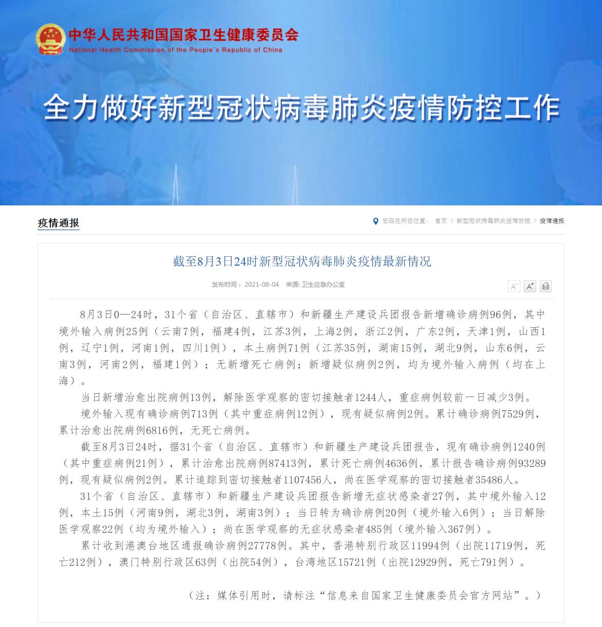 据国家卫健委网站消息,8月3日0—24时,31个省(自治区、直辖市)和新疆生产建设兵团报告新增确诊病例96例,其中境外输入病例25例(云南7例,福建4例,江苏3例,上海2例,浙江2例,广东2例,天津1例,山西1例,辽宁1例,河南1例,四川1例),本土病例71例(江苏35例,湖南15例,湖北9例,山东6例,云南3例,河南2例,福建1例);无新增死亡病例;新增疑似病例2例,均为境外输入病例(均在上海)。
