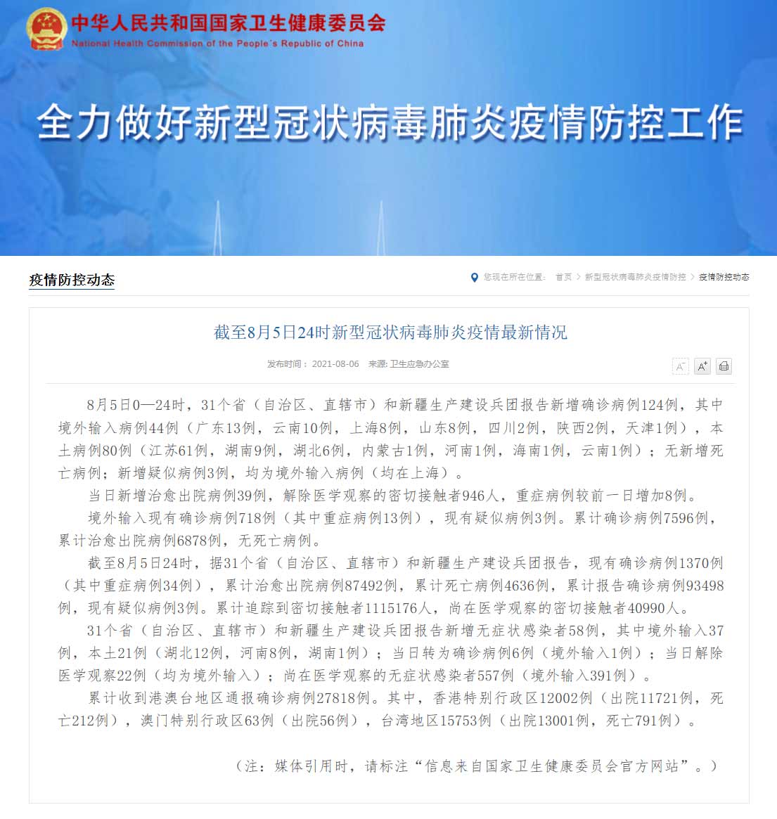 中工网讯 据中华人民共和国国家卫生健康委员会网站消息,8月5日0—24时,31个省(自治区、直辖市)和新疆生产建设兵团报告新增确诊病例124例,其中境外输入病例44例(广东13例,云南10例,上海8例,山东8例,四川2例,陕西2例,天津1例),本土病例80例(江苏61例,湖南9例,湖北6例,内蒙古1例,河南1例,海南1例,云南1例);无新增死亡病例;新增疑似病例3例,均为境外输入病例(均在上海)。