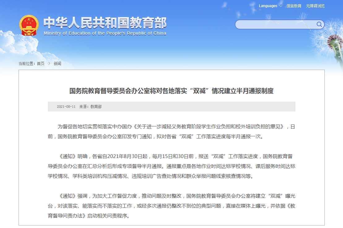 《通知》明确,各省自2021年8月30日起,每月15日和30日前,报送“双减”工作落实进度,国务院教育督导委员会办公室在汇总分析后形成专项督导半月通报。通报重点是各地作业时间达标学校情况、课后服务时间达标学校情况、学科类培训机构压减情况、违规培训广告查处情况和群众举报问题线索核查情况等。