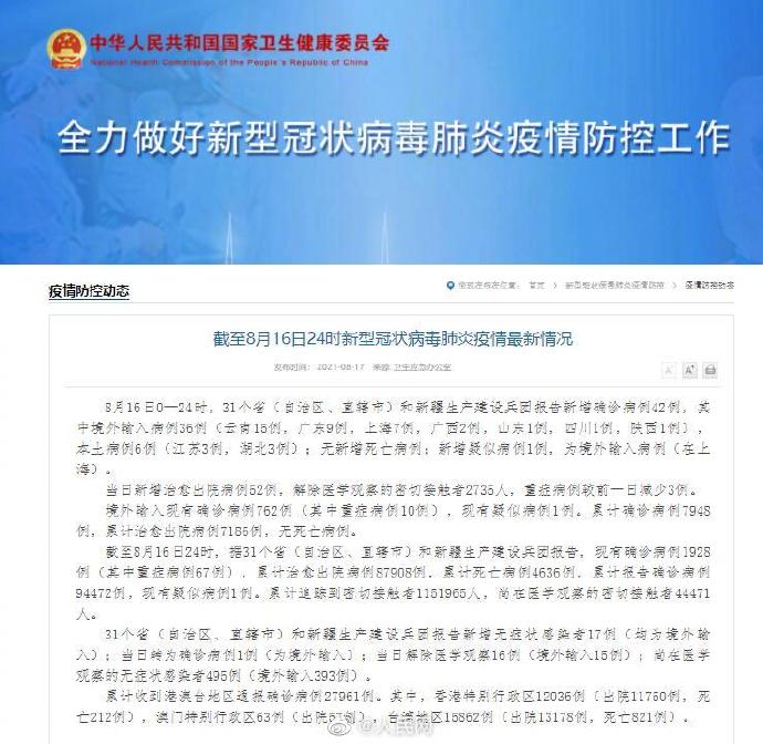 中工网讯 据国家卫健委官网消息,8月16日0—24时,31个省(自治区、直辖市)和新疆生产建设兵团报告新增确诊病例42例,其中境外输入病例36例(云南15例,广东9例,上海7例,广西2例,山东1例,四川1例,陕西1例),本土病例6例(江苏3例,湖北3例);无新增死亡病例;新增疑似病例1例,为境外输入病例(在上海)。