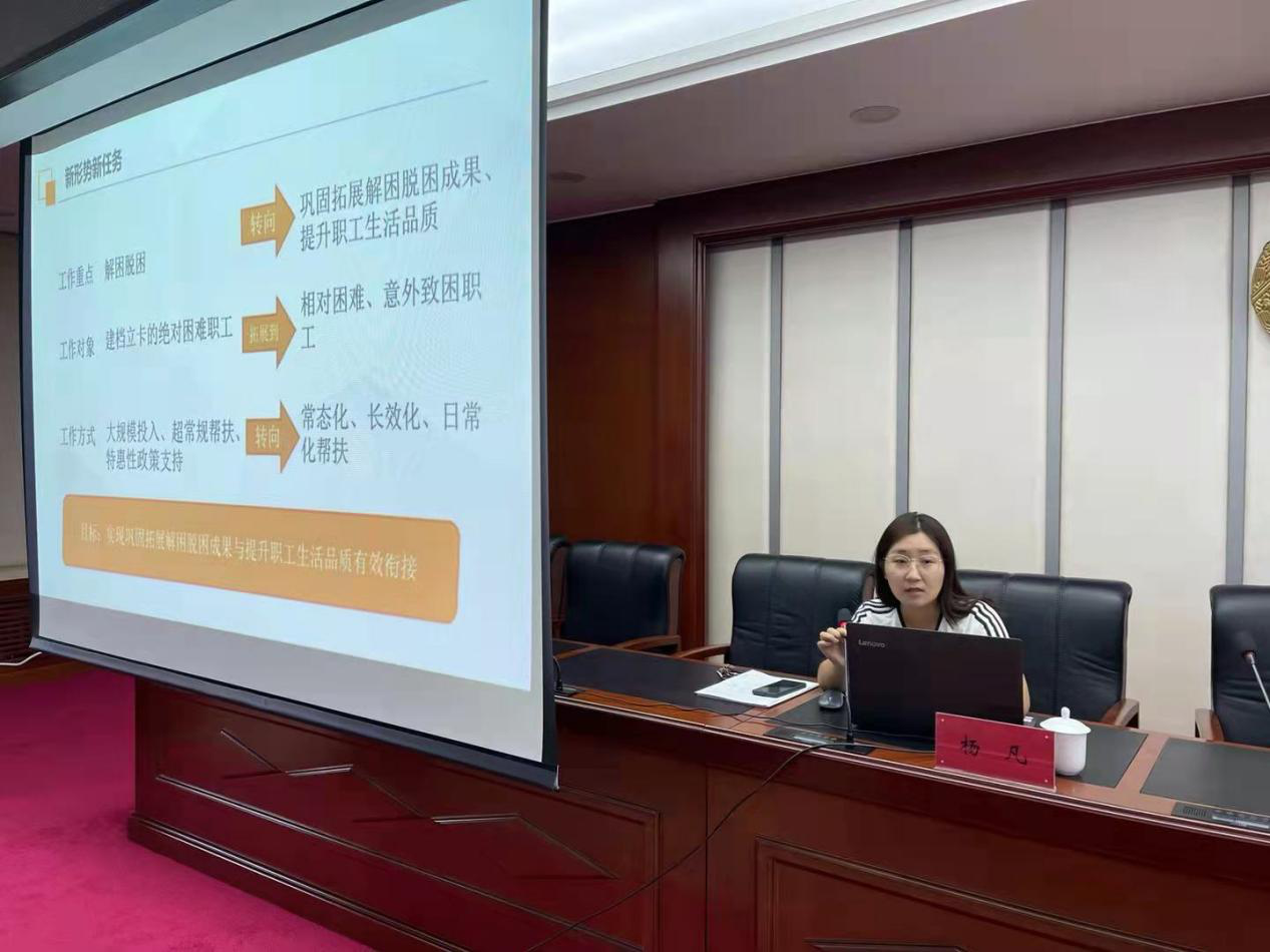 会上,杨凡围绕内蒙古自治区总工会新修订印发的《内蒙古自治区工会专项帮扶资金使用管理实施细则(暂行)》、《内蒙古自治区困难职工档案管理办法(暂行)》文件从新形势新任务、巩固拓展解困脱困成果、困难职工帮扶常态化工作等方面对困难职工帮扶民生工程规定进行解读,详细阐释了困难职工的资金使用标准、建档标准、救助项目、建档及救助流程,并现场对各基层工会干部提出的问题进行解答。