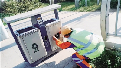 昨日上午,记者来到通道南街,看到环卫工人正在对路边的果皮箱进行更换。