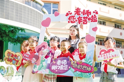 师生合影庆祝教师节到来 呼和浩特晚报记者 许婷 摄