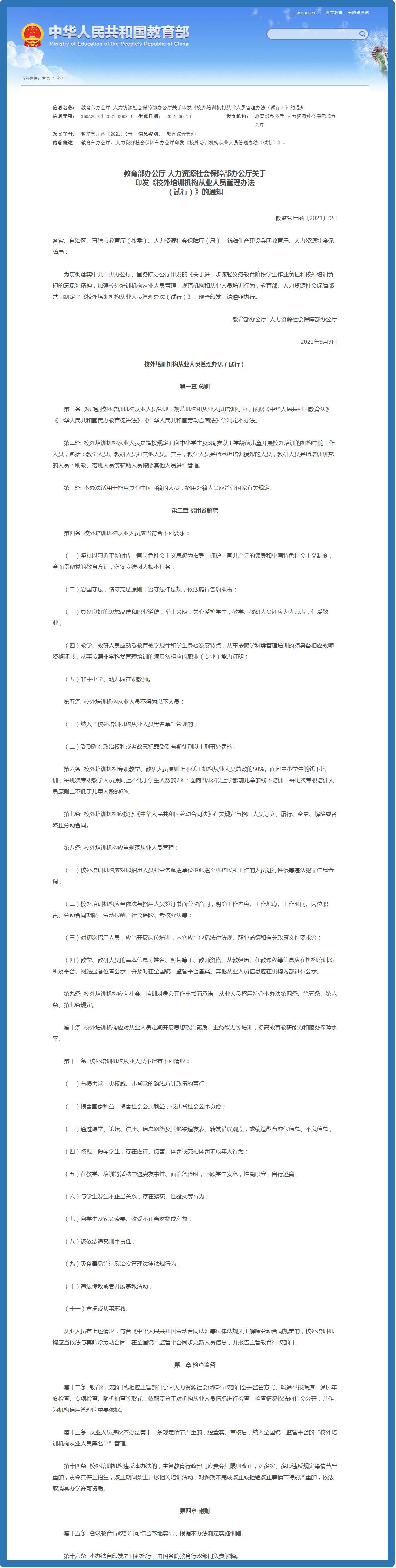 中工网讯 据教育部网站消息,为贯彻落实中共中央办公厅、国务院办公厅印发的《关于进一步减轻义务教育阶段学生作业负担和校外培训负担的意见》精神,加强校外培训机构从业人员管理,规范机构和从业人员培训行为,教育部、人力资源社会保障部共同制定了《校外培训机构从业人员管理办法(试行)》。