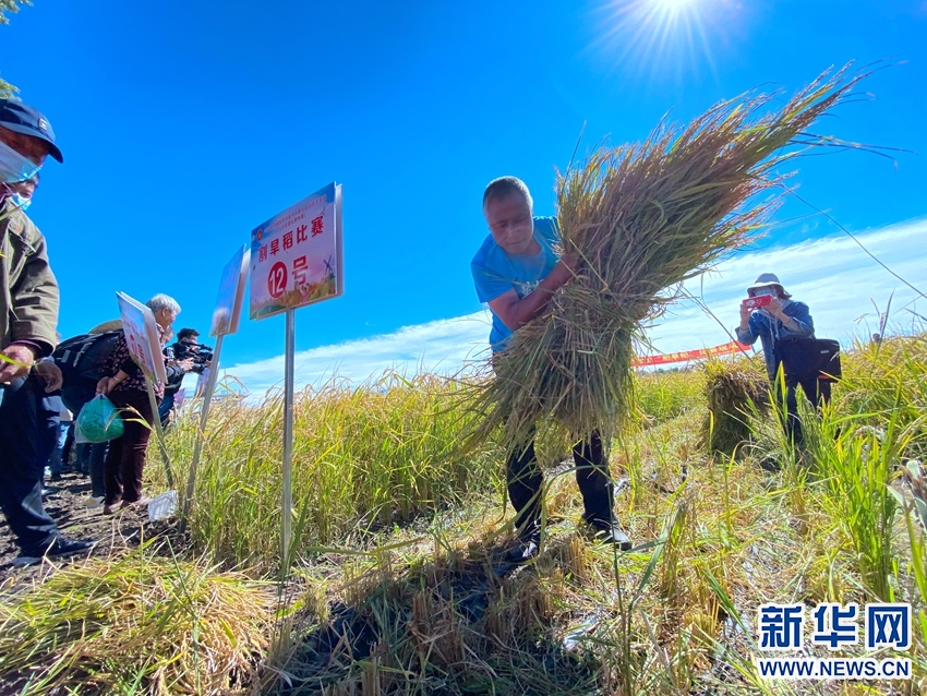 农民在进行割旱稻比赛。新华网发 (金泉 摄)