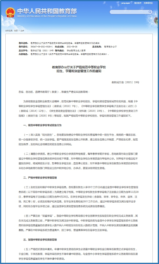 中工网讯 据教育部网站消息,近日,教育部办公厅发布关于严格规范中等职业学校招生、学籍和资助管理工作的通知。