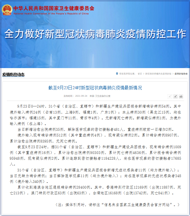 中工网讯 据国家卫生健康委员会官方网站消息,9月23日0—24时,31个省(自治区、直辖市)和新疆生产建设兵团报告新增确诊病例54例。其中境外输入病例24例(云南13例,上海9例,福建1例,广东1例);本土病例30例(黑龙江15例,均在哈尔滨市;福建15例,其中厦门市11例、莆田市4例)。无新增死亡病例。新增疑似病例1例,为境外输入病例(在上海)。