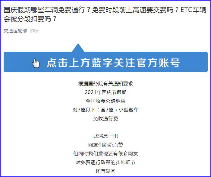 中工网讯 根据国务院有关通知要求,2021年国庆节假期全国收费公路继续对7座以下(含7座)小型客车免收通行费。此消息一出,网友们纷纷点赞,但同时还有很多网友对免费通行政策的实施细节存疑,9月28日,交通运输部微信公众号发文解答。