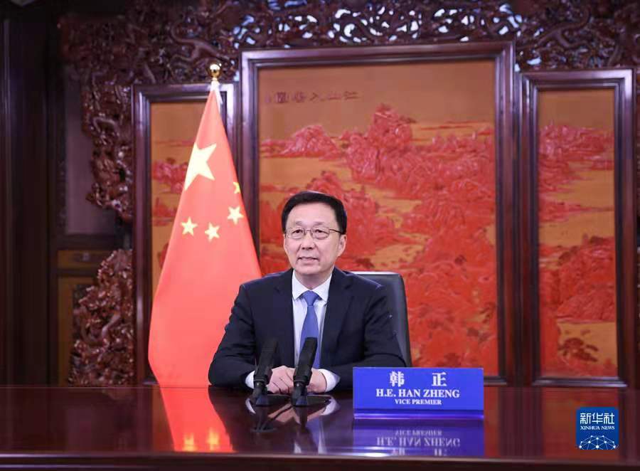 10月14日,中共中央政治局常委、国务院副总理韩正在北京以视频方式出席“2021俄罗斯能源周”国际论坛并发表致辞。新华社记者 王晔 摄
