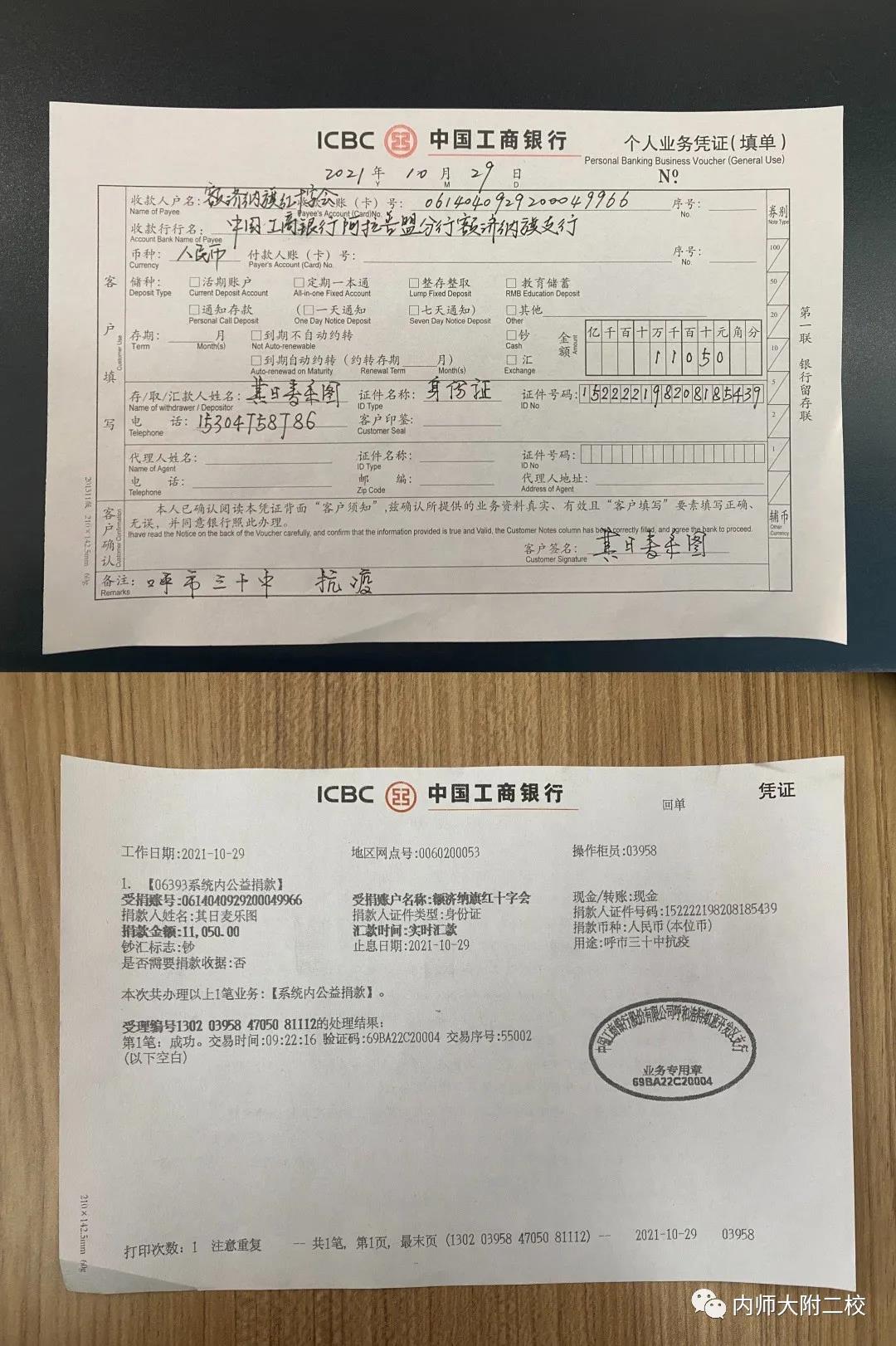此次爱心捐款活动得到了全校教职工的积极响应,截至10月29日上午8时许,我校爱心捐款金额共为11050元。同时已于10月29日上午9时许汇至额济纳旗红十字会指定账户,该笔捐赠将专款专用于额济纳旗抗击新型肺炎疫情防控工作。