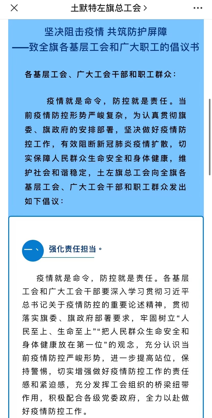 土左旗总工会利用微信公众号等宣传阵地,发出倡议书,号召全旗各基层工会、广大职工以各种方式积极投身疫情防控阻击战,在打赢疫情防控阻击战中展现担当作为;大力宣传、转载防疫知识和现阶段疫情防控政策和公告,引导职工群众做好个人防护,科学参与疫情防控,不制谣、不信谣、不传谣,减少公众聚集活动,理性、正确看待当前防控形势,自觉维护社会大局稳定。