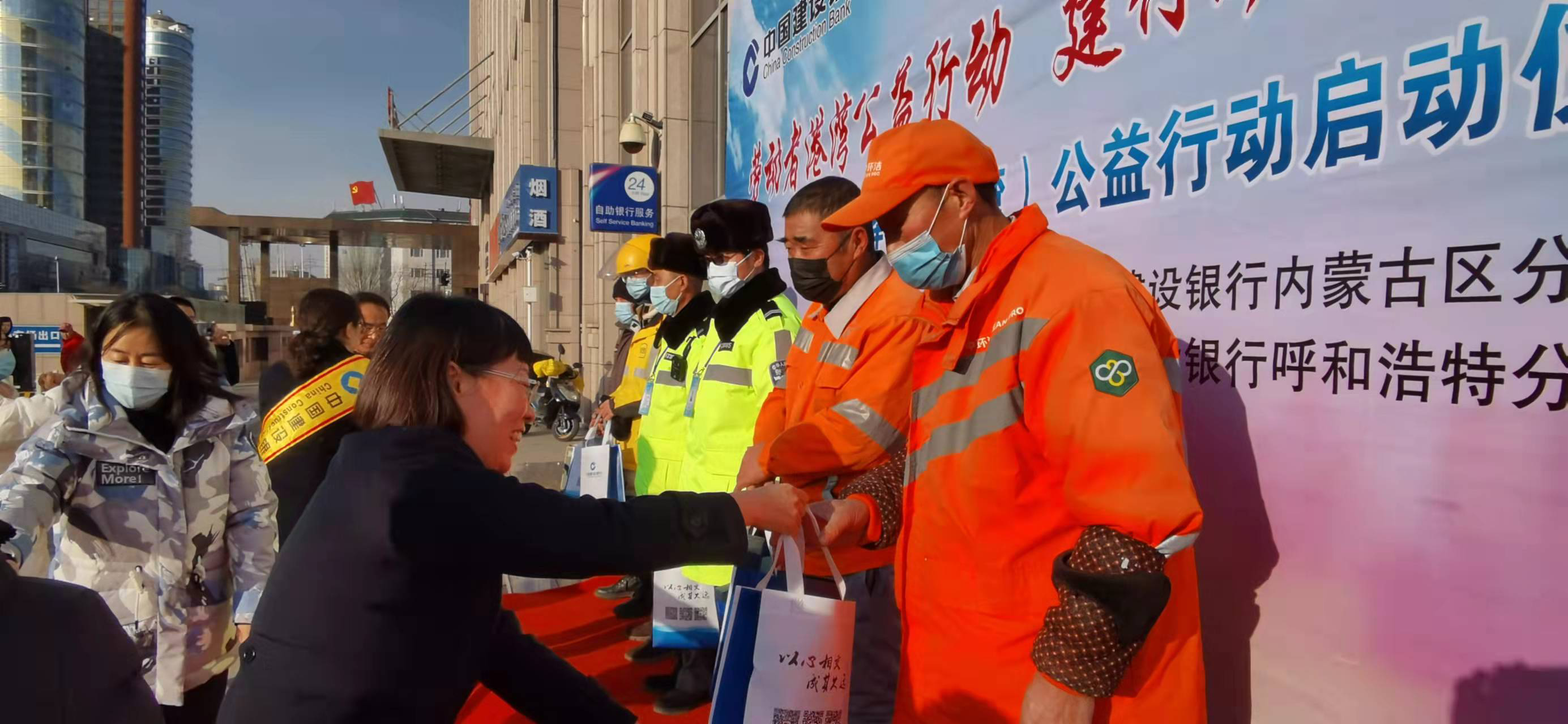 呼市总工会保障部、三产服务业工会负责人及中国建设银行呼和浩特分行工会主席等为交警、外卖送餐员、环卫工人等户外劳动者送上慰问礼包。