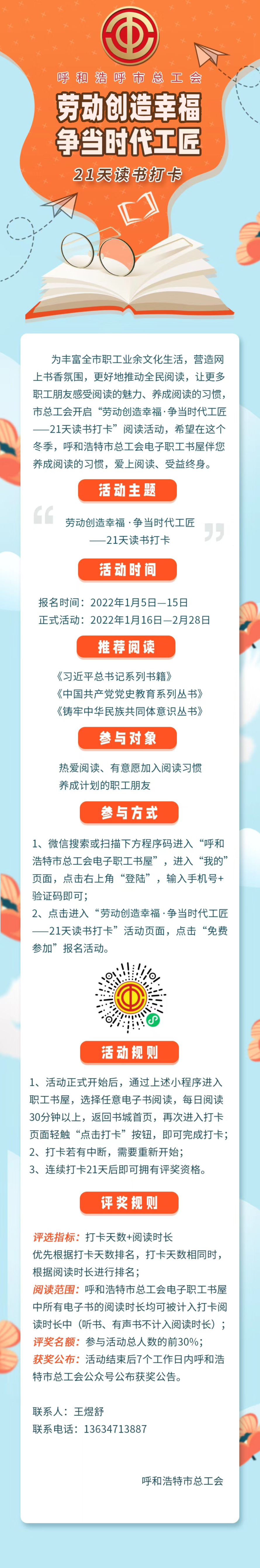 为丰富全市职工业余文化生活,营造网上书香氛围,更好地推动全民阅读,让更多职工朋友感受阅读的魅力、养成阅读的习惯,市总工会开启“劳动创造幸福·争当时代工匠”——21天读书打卡”阅读活动,希望在这个冬季,呼和浩特市总工会电子职工书屋伴您养成阅读的习惯,爱上阅读、受益终身。