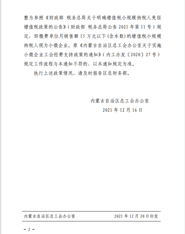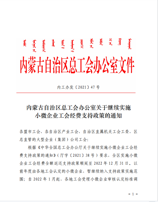 近日,内蒙古自治区总工会发布《关于继续实施小微企业工会经费支持政策的通知》,明确: