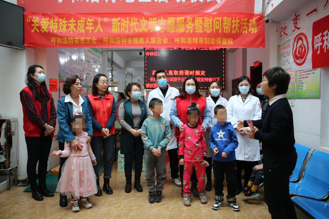 为进一步助力首府文明城市建设,弘扬志愿精神,全面推进我市特殊未成年人工作开展, 1月14日上午,呼和浩特市总工会联合呼和浩特市残疾人联合会、呼和浩特市妇幼保健院,深入呼和浩特市丁香残疾人康复中心开展“关爱特殊未成年人”新时代文明志愿服务暨慰问帮扶活动。