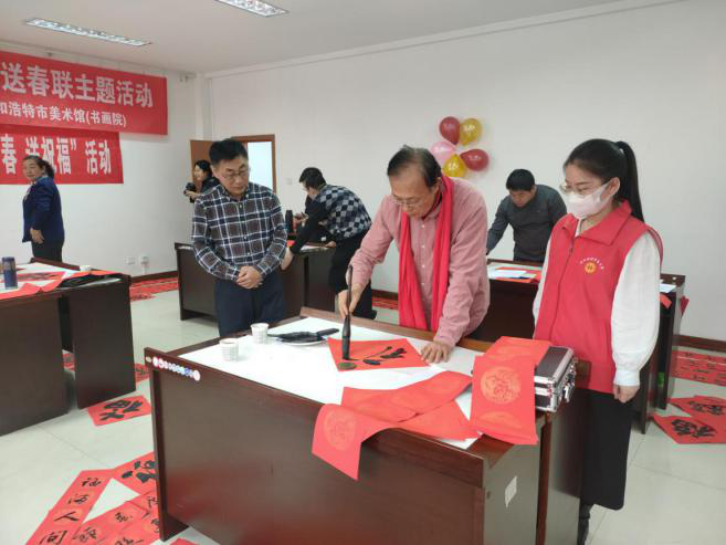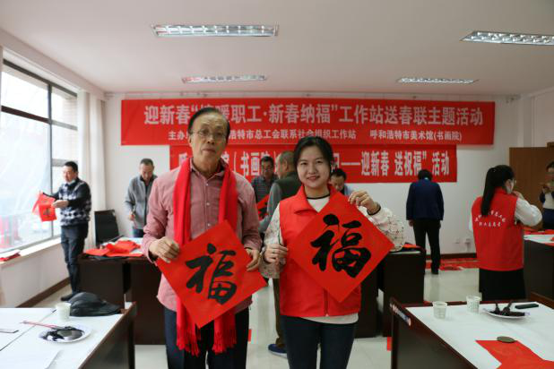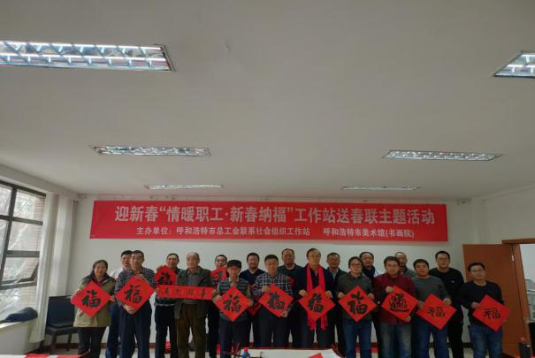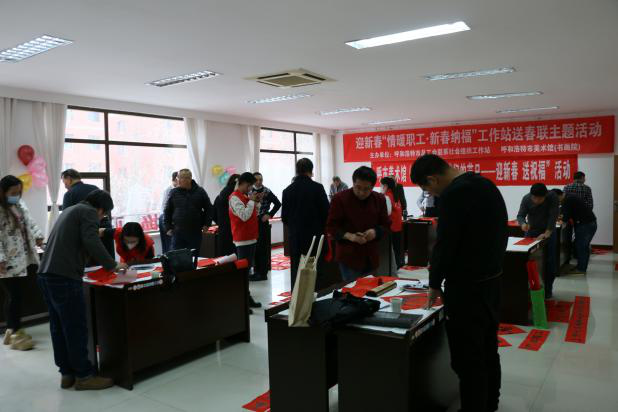 翰墨飘香书万福,新春祝福暖人心,1月24日,呼和浩特市总工会联系社会组织工作站、呼和浩特市美术馆联合举办迎新春“情暖职工·新春纳福”送春联主题活动。来自呼和浩特市美术馆、社区党员志愿者等9位书法老师现场为百余名机关干部职工写春联、送福字,把新春的美好祝福送给广大职工。